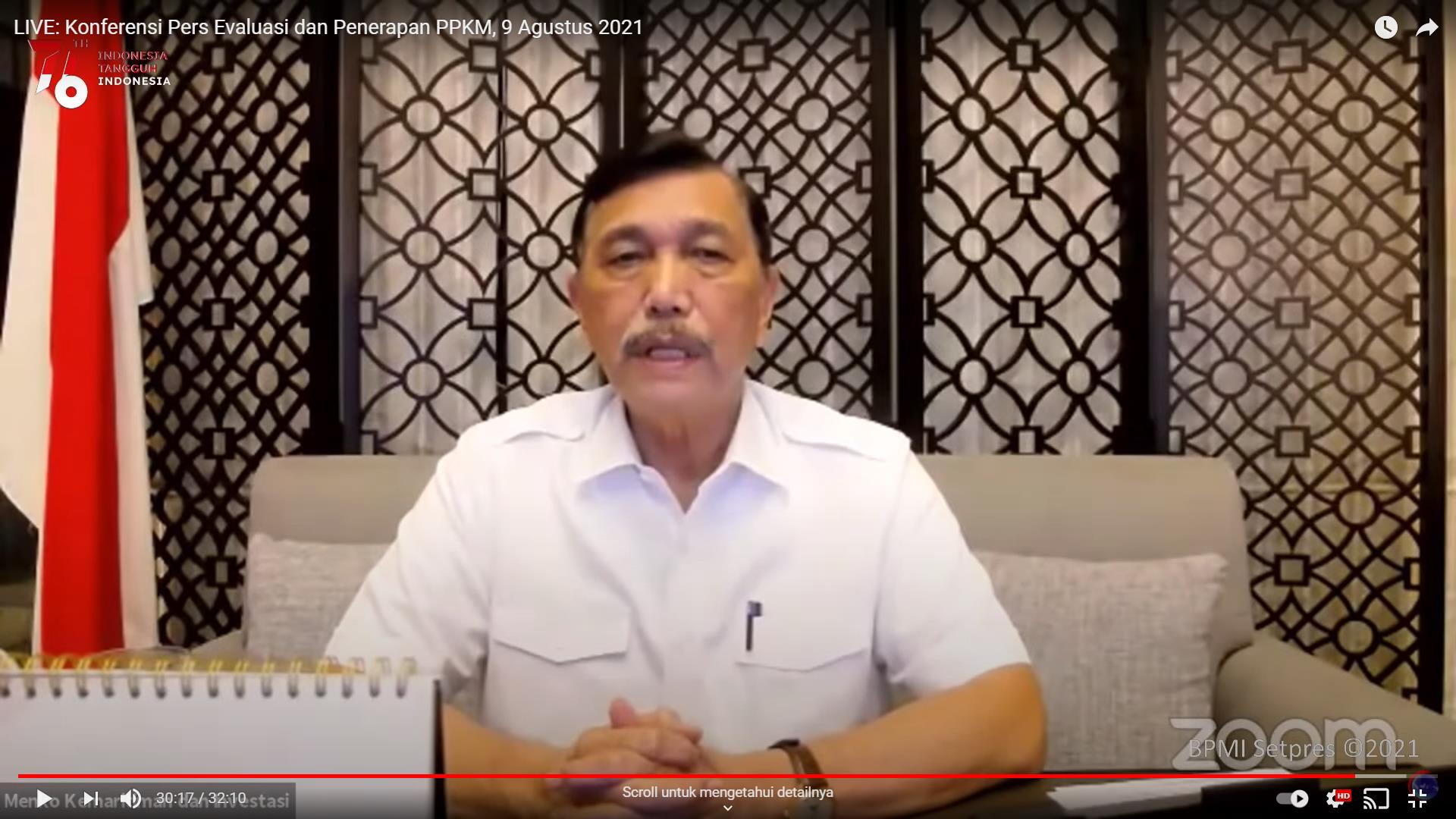 Hal tersebut diungkapkan langsung oleh Menteri Koordinator Bidang Kemaritiman dan Investasi (Menko Marves), Luhut Binsar Pandjaitan, dalam keterangan persnya yang disiarkan secara virtual, di Jakarta, Senin (09/08/2021).