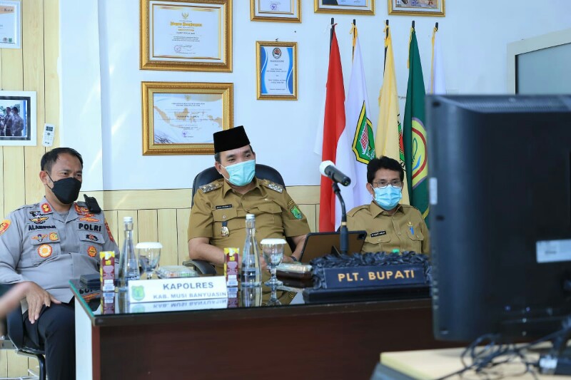 MUSI BANYUASIN, – Plt Bupati Musi Banyuasin Beni Hernedi SIP didampingi Asisten Bidang Pengembangan Perekonomian dan Pembangunan Setda Muba Drs H Yusuf Amilin dan Kapolres Muba AKBP Alamsyah Pelupessy SH SIk, mengikuti arahan Presiden Republik Indonesia kepada Kepala Daerah seluruh Indonesia terkait penanganan pandemi Covid-19 secara virtual, di Kantor Camat Sungai Lilin, Senin (7/2/2022).