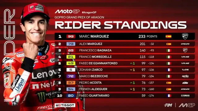 MOTOGP, – Klasemen MotoGP usai race GP Aragon 2025. Balapan utama race MotoGP Aragon 2025 kembali dimenangkan oleh Marc Marquez (+25 poin), dengan tambahan poin tersebut, Marc semakin kokoh dipuncak dengan total 233 poin.